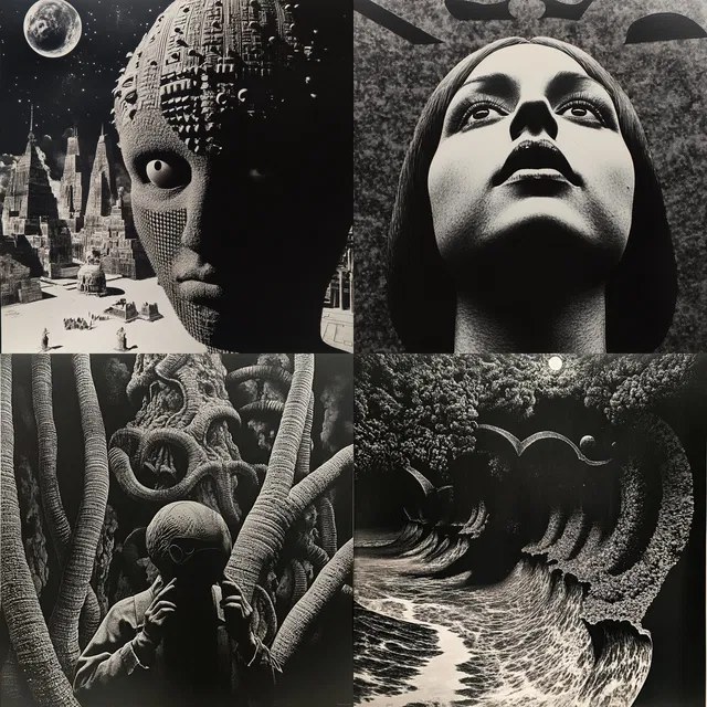 Доминируют сюрреализм и символизм, а монохроматическая палитра усиливает текстурную глубину и сложные детали. Органические формы и геометрическая сложность создают сюрреалистичную атмосферу, напоминающую антиутопические и мифические сюжеты.