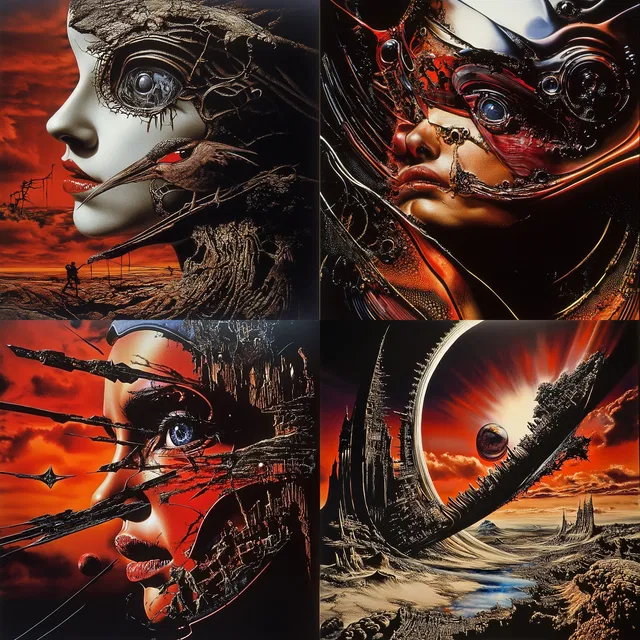 Активное использование ярких красных и глубоких чёрных цветов создаёт драматическую и сюрреалистичную атмосферу, напоминающую эстетику антиутопий и киберпанка. Стиль отличается сложными деталями и глубиной текстуры, часто включает в себя металлические отблески и органические формы.