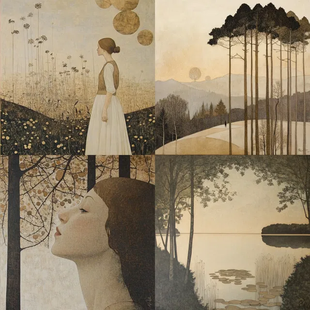 Этому стилю присущи приглушённые земляные тона и текстурное богатство, которые создают атмосферу сказочного спокойствия и ностальгического тепла. Органичные формы и вертикальность характерны для архитектурных изображений, а портреты передают эфемерное присутствие с помощью мягкого фокуса и нежных выражений лиц.