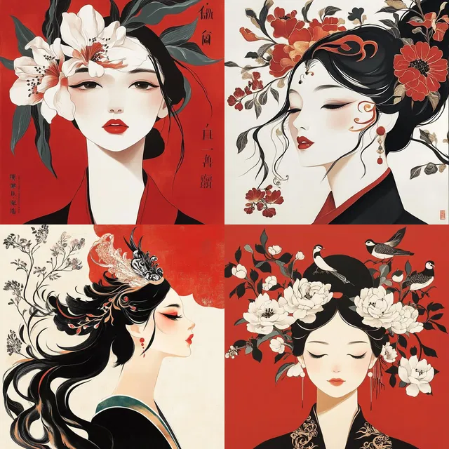 Этот стиль — удивительное сочетание традиционной азиатской эстетики с элементами современного дизайна. Его отличает смелое использование красного и чёрного цветов, что создаёт яркое, но гармоничное визуальное впечатление. Замысловатые линии и стилизованные формы вызывают ощущение элегантности и изысканности, напоминая классическое азиатское искусство.