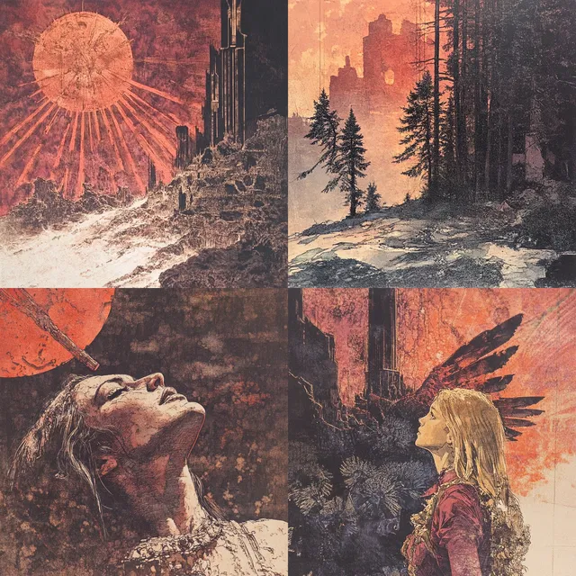 Этот стиль завораживает своей многослойностью и сложной текстурой. Он привлекает внимание благодаря детализированным элементам и палитре в оттенках сепии, которые пробуждают чувство вневременности и ностальгии.