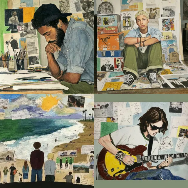 Доминирует яркая эстетика коллажей с богатым переплетением текстур и цветов. Этот стиль отличается созданием многослойных эклектичных композиций, вдохновлённых различными источниками. Ностальгический и рефлексивный, он передаёт ощущение памяти и идентичности. Хотя его сила заключается в динамичном подходе с использованием разнообразных техник, ему может не хватать точности в фотореалистичных контекстах. Он идеально подходит для редакционных и иллюстративных целей, предлагая уникальную глубину повествования.