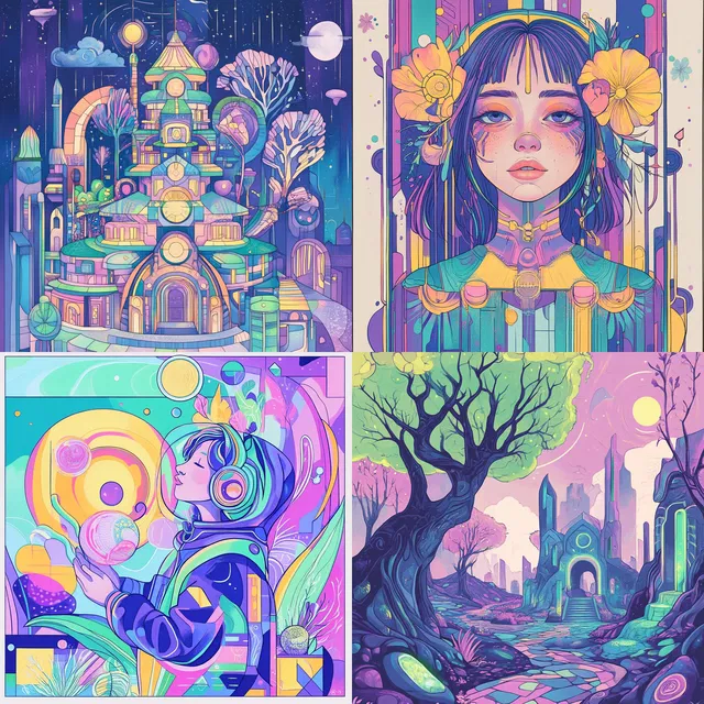 Этот яркий и динамичный стиль отличается смелым использованием пастельных тонов и неоновых акцентов, что создаёт причудливую, сказочную атмосферу. Здесь преобладают сложные линии и детальные узоры, часто вдохновлённые психоделикой и искусством ар-нуво.