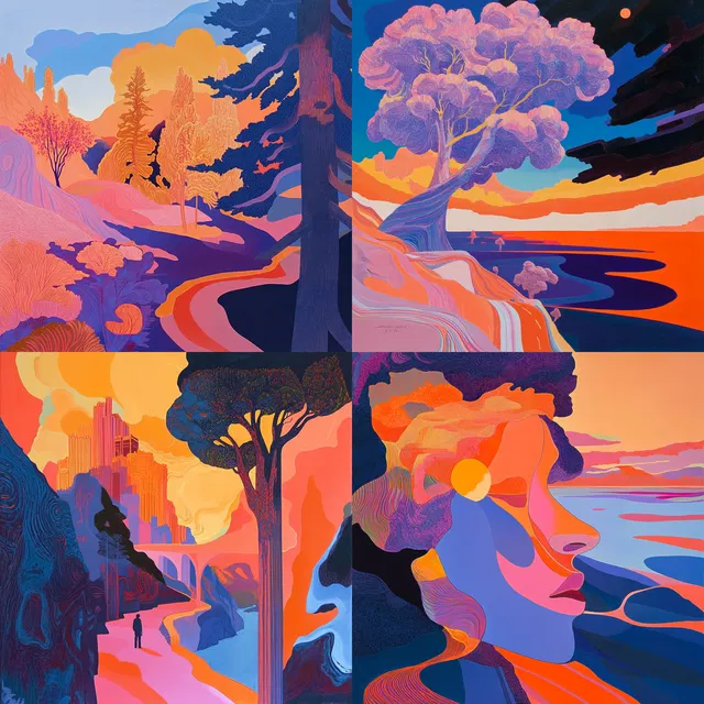 Здесь доминирует яркая абстракция с поразительным использованием смелых, динамичных цветовых палитр, которые создают сюрреалистичную, сказочную атмосферу. Стиль отличается выразительной абстракцией и современным сюрреализмом. Для создания ощущения движения и энергии используются многослойные композиции и яркие градиенты.