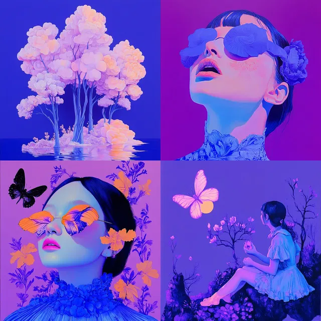 Этот стиль — яркий и сюрреалистичный, он завораживает своей неземной палитрой цветов и сказочными композициями. В нём преобладают электрический синий и неоново-розовый цвета, которые создают потусторонние пейзажи и фигуры, вызывающие мистическую атмосферу.
