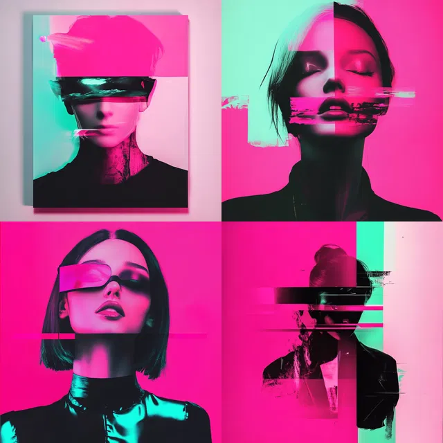 Неоновый глюк и сюрреализм очаровывают своей яркой неоновой палитрой и смелыми контрастами, создавая динамичное взаимодействие цвета и формы. В основе стиля — эффекты глюча и абстрактные искажения, которые формируют сюрреалистичную атмосферу, ставящую под сомнение восприятие. В нём явно прослеживаются влияния киберпанка и футуризма, которые проявляются в фрагментарных образах и городских пейзажах.
