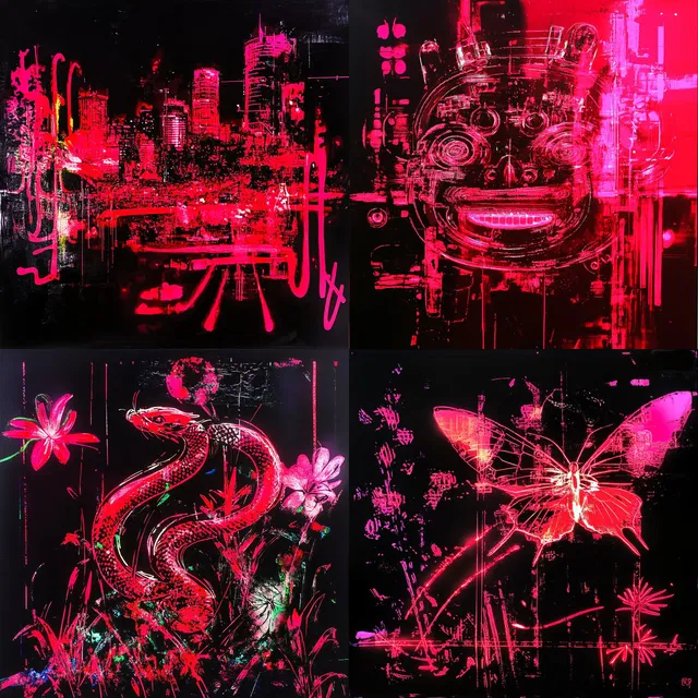 Визуалы с неоновыми оттенками преобладают, отличаясь своей электрической яркостью и светящимися контрастами. Стиль превосходно создаёт атмосферу футуристического сияния с помощью сияющих наложений и динамичных композиций. Преобладают неоново-розовые и ярко-красные оттенки, которые усиливают научно-фантастическую атмосферу в различных контекстах.