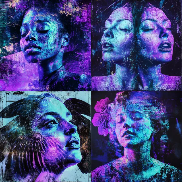 В этом стиле преобладают яркие неоновые оттенки, которые создают сказочную атмосферу за счёт многослойных текстур и сюрреалистичных композиций. Электрические цвета и контрастные тона определяют визуальное повествование, сочетая в себе элементы футуризма и мифологии.