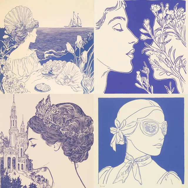 Сложный, витиеватый рисунок линий и монохромная палитра определяют этот стиль, вызывая ощущение ностальгической элегантности и вечной красоты. Использование синих и кремовых тонов создаёт гармоничную и безмятежную атмосферу в различных темах — от викторианской моды до футуристических городских пейзажей.