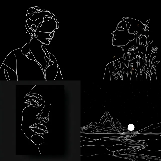 Использование непрерывной линии создаёт минималистичный, но выразительный визуальный язык, подчёркивающий простоту и элегантность. Монохромная палитра стиля усиливает его изысканность и ненавязчивость, позволяя зрителю сосредоточиться на чистоте формы и контура.