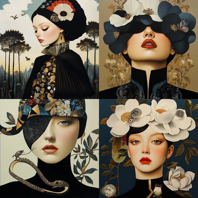 Этот стиль отличается сюрреалистической элегантностью, сочетая стилизованный реализм с замысловатыми деталями. Он создаёт сказочную красоту с помощью мягкого освещения и драматических контрастов, часто включая изображения элегантных фигур и богато украшенные элементы.