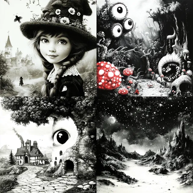 В этом стиле главенствуют сюрреализм и причудливость. Его отличает сказочность пейзажей и фантастические элементы. Высокая контрастность и монохромные цветовые решения усиливают загадочную атмосферу, а сложные текстуры и детальные композиции добавляют глубины.