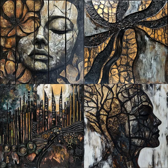 Этот стиль отличается насыщенной текстурой и многослойностью. Он создаёт ощущение органичной сложности благодаря своим мозаичным композициям. Преобладают землистые и натуральные тона, которые создают тёплую и располагающую атмосферу. Замысловатые узоры и плавные формы этого стиля указывают на влияние модерна и модернизма, а его смелые, динамичные элементы отсылают к футуризму и ретрофутуризму.