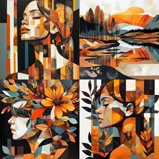 Преобладают текстурированные поверхности и детальная проработка, что отражает влияние кубизма, добавляя глубину и сложность. Этот стиль отлично подходит для редакционных и модных приложений, предлагая динамичные и энергичные визуальные решения. Однако ему не хватает фотореализма, что может ограничить его эффективность в более реалистичных контекстах.