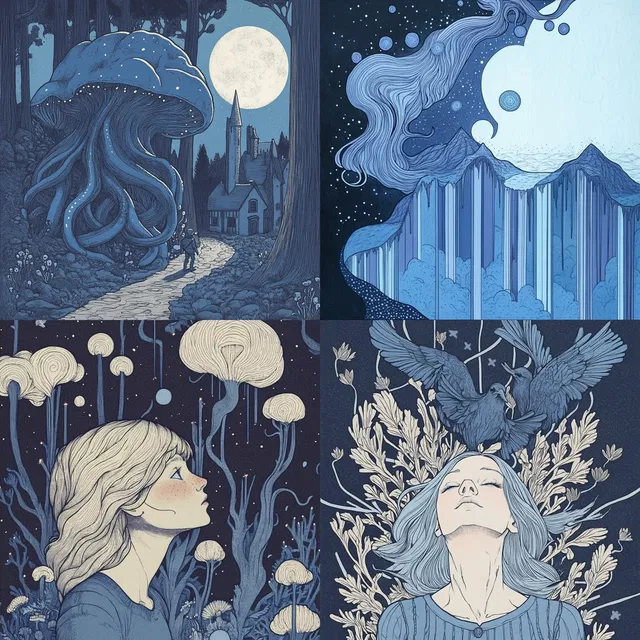 Иллюстрации в стиле Ethereal Blue завораживают своей сложной линейной работой и стилизованными композициями, вызывая ощущение фантазии и чуда. Спокойное использование холодных синих тонов создаёт единое визуальное повествование на разнообразные темы — от архитектурных чудес до мифических существ.