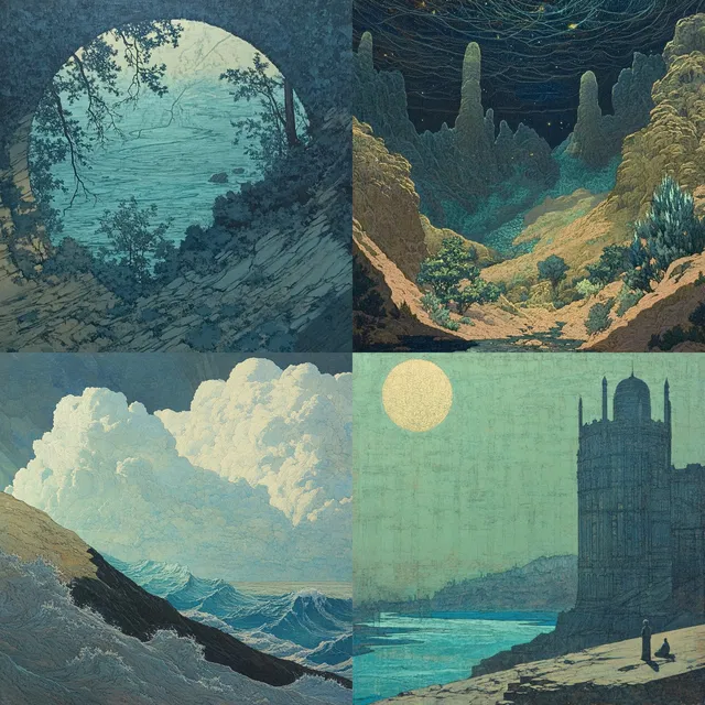 Этот стиль отличается замысловатостью и богатством деталей. Он прекрасно подходит для создания сказочных, эфемерных пейзажей и персонажей под влиянием стиля ар-нуво. Использование приглушённых пастельных цветов и фактурной манеры письма вызывает чувство ностальгии и фантазии, напоминая художественные течения прерафаэлитов и романтиков.