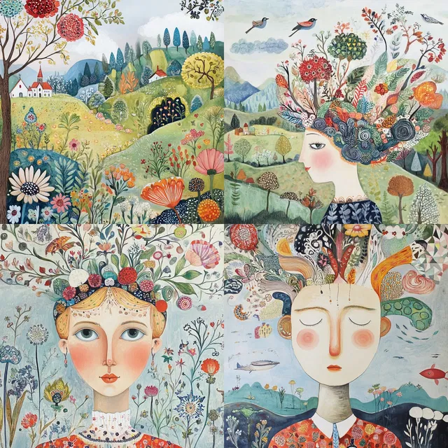 Причудливый и чарующий стиль, который передаёт сущность природы и фантазии через сложные детали и игривые композиции. Пастельные тона и мягкие градиенты создают атмосферу сновидений, а органические формы и цветочные мотивы наполняют изображения ощущением волшебства.