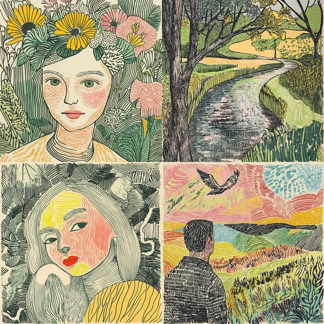 В этих композициях преобладает сложная линейная работа, напоминающая традиционные техники гравировки и офорта. Использование штриховки крестом и детальных узоров создаёт текстурное богатство, которое одновременно привлекает внимание и отличается сложностью. Геометрические и абстрактные элементы органично интегрированы, придавая работам стилизованное и декоративное качество.