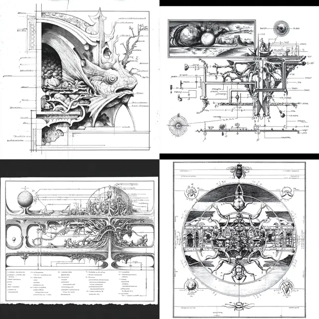 Сложные линии и гравированные текстуры занимают доминирующее положение, создавая симфонию технической точности и аналитической композиции. Стиль отличается мастерским исполнением детальных схем и сложных диаграмм, напоминая о влиянии эпохи Ренессанса и барокко. Монохромные палитры подчёркивают эстетику гравировки, а симметричный баланс и геометрическая точность подчёркивают архитектурные достоинства стиля.