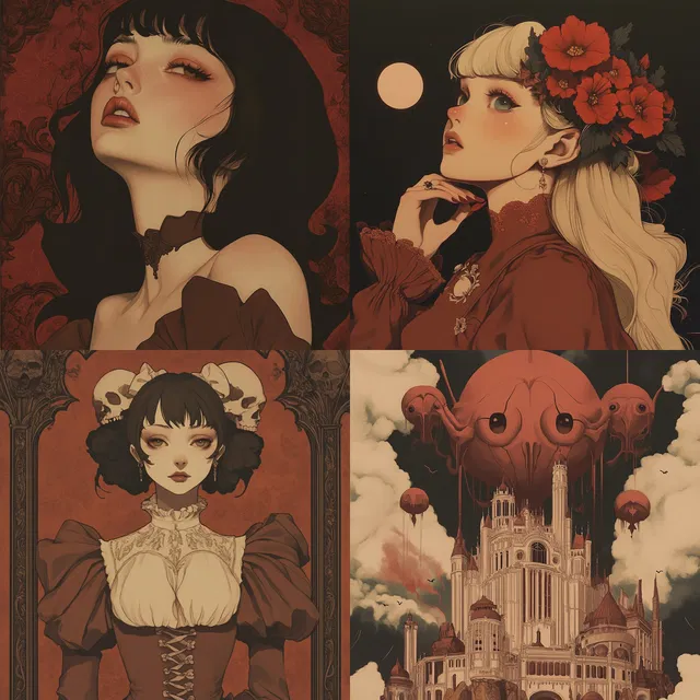 Этот стиль сочетает в себе элементы неоготики и ар-нуво, создавая завораживающую и воздушную эстетику. Замысловатые линии и богато украшенные детали определяют его визуальную идентичность, а тёплая палитра сепии придаёт винтажный шарм. Стиль прекрасно передаёт викторианскую элегантность и мифические элементы, создавая богатую глубину повествования. Однако ему может быть сложно передать фотореализм и современные темы, что делает его идеальным для исторического и фэнтезийного контекста.