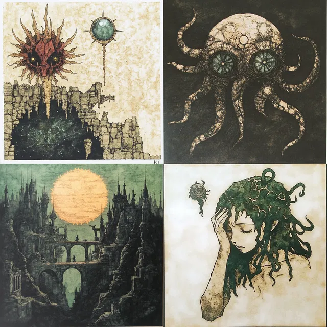 Этот стиль отличается замысловатыми деталями и текстурным богатством, создавая сюрреалистичную и атмосферную глубину в различных темах. Использование приглушённых тонов и земляных цветов усиливает его мифические и сказочные качества, часто заимствуя элементы фэнтези, стимпанка и готического искусства. Композиции многослойные и сложные, с акцентом на органических формах и сюрреалистичных пейзажах.