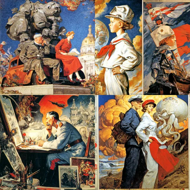 Этот стиль идеально подходит для редакционных иллюстраций и пропагандистского искусства, создавая ощущение грандиозности и эпичности, но может не подойти для минималистичных или сдержанных проектов.