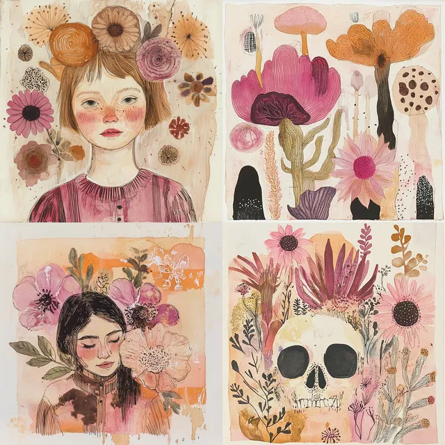 Отличительный визуальный стиль, который характеризуется мягкой пастельной палитрой, органическими формами и причудливыми мотивами. Этот стиль создаёт сказочную, неземную атмосферу благодаря выразительной манере письма кистью и фактурным поверхностям. Он прекрасно подходит для художественных применений, таких как дизайн текстиля и иллюстрация, но может быть не слишком точен в контексте фотореализма.