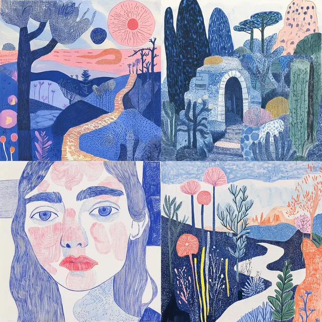 Этот яркий и причудливый стиль отличается экспрессивным использованием цвета и текстуры, создавая сказочную атмосферу, которая находит отклик в различных темах и сюжетах. Постоянное применение синих тонов в сочетании с пастельными акцентами придаёт композициям гармоничное и эфемерное качество.