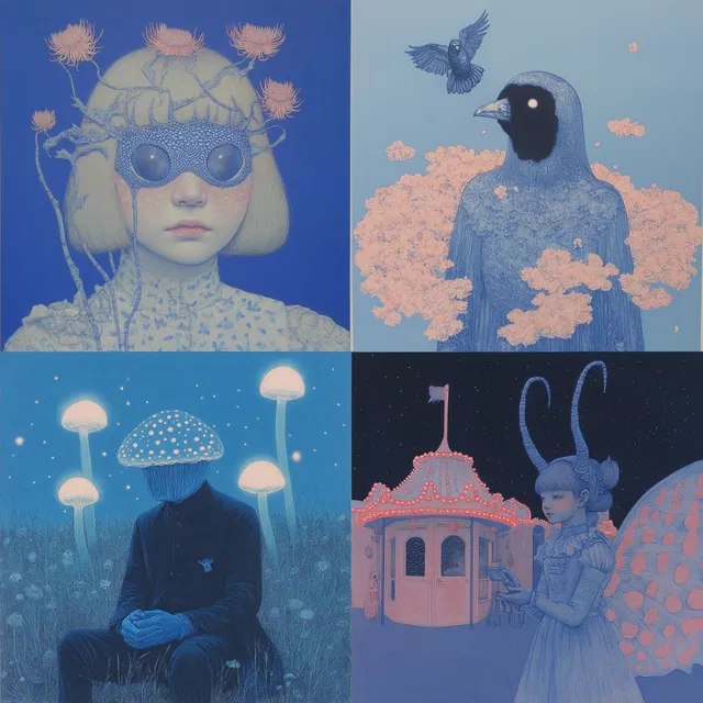 В основе стиля — сложные детали и тонкие контрасты, часто раскрывающие темы мистики и трансформации. Использование монохромных синих оттенков усиливает сюрреалистичность и причудливость композиций, погружая зрителей в мир, где сосуществуют фантастические существа и мифические пейзажи.