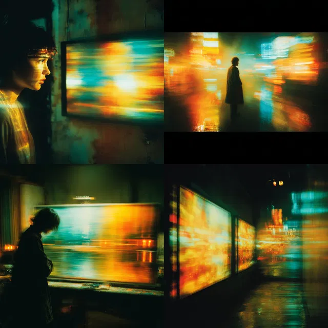 Преобладают размытие в движении и призрачное освещение, создавая сказочную, сюрреалистичную атмосферу, искажающую реальность. Неоновые оттенки и мистическое свечение усиливают абстрактный экспрессионизм, напоминая работы Герхарда Рихтера и Марка Ротко.