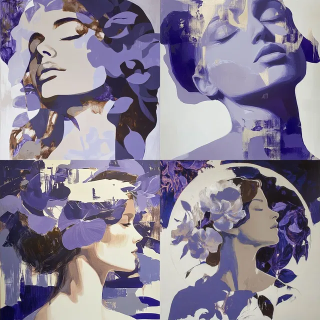 Преобладает спокойная цветовая гамма и мягкое освещение. Стиль объединяет выразительность живописи со структурированными элементами дизайна.