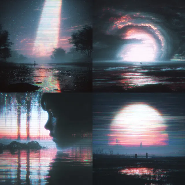 Доминируют эфемерное освещение и хроматическое сияние, которые создают сюрреалистичные текстуры и сказочные композиции. Этот стиль отличается умением сочетать эстетику ретрофутуризма и киберпанка с влиянием импрессионизма и сюрреализма, создавая загадочные сюжеты и ностальгическую атмосферу. Использование эффектов глюча и цифрового искажения придаёт ему уникальный ретрофутуристический оттенок, хотя иногда ему не хватает фотореализма в реалистичных контекстах.