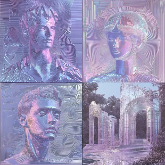 В этом стиле преобладают отражающие поверхности и переливающиеся текстуры, которые создают сказочную атмосферу в различных темах. Он особенно хорош для футуристических и эфемерных композиций, где используются металлические отделки и мерцающие детали.