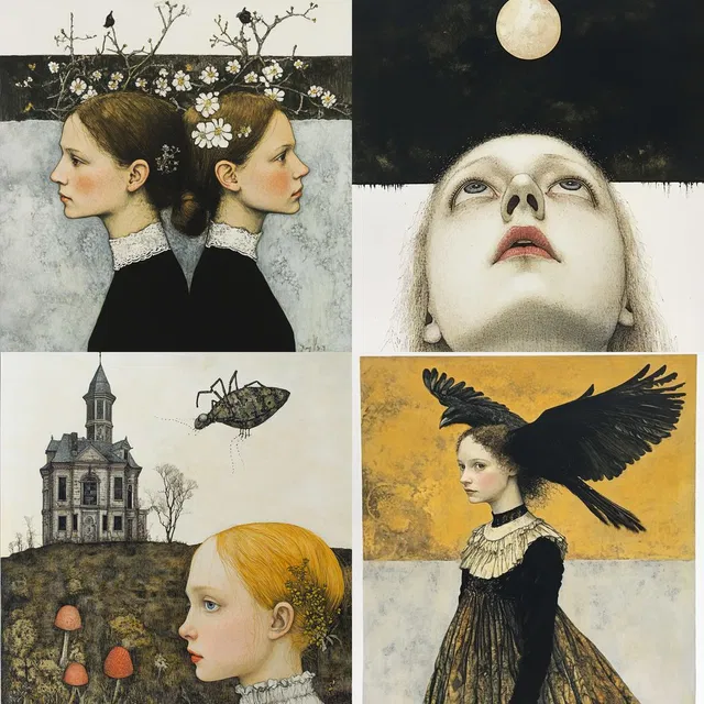 Эфирный сюрреализм очаровывает своей сказочностью и запутанным символизмом. Приглушённая цветовая палитра и мягкое освещение создают потустороннюю атмосферу, а детальные текстуры и сбалансированные композиции усиливают визуальную привлекательность стиля.