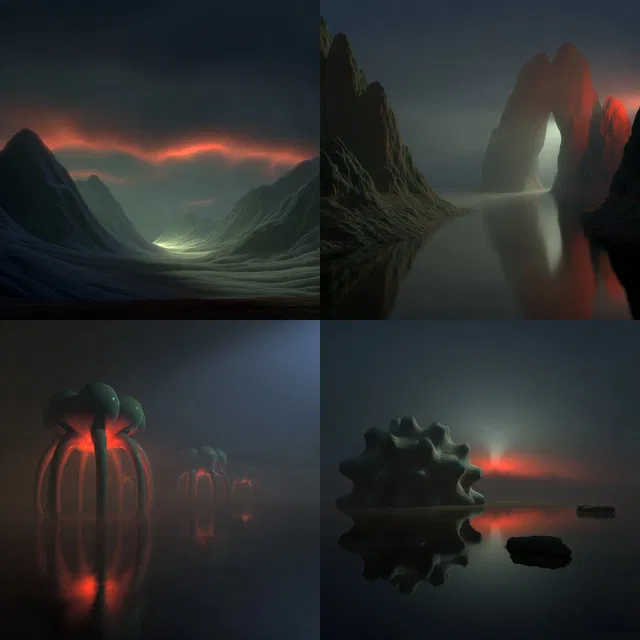 Эфирная аура и сказочный свет определяют этот стиль, создавая мистическую атмосферу в различных темах. Отражающие поверхности и зеркальные плоскости усиливают сюрреалистичность, а приглушённые тона и мягкие градиенты способствуют созданию загадочной атмосферы.