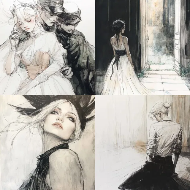 Этот изысканный и воздушный стиль передаёт мечтательную атмосферу с помощью выразительных линий и мягких теней. Приглушённые тона и плавные градиенты создают романтическую и мистическую обстановку, напоминая об искусстве модерна. Замысловатые композиции и детализированные структуры придают ощущение элегантности и таинственности, что делает стиль идеальным для фантастических и мифологических тем.