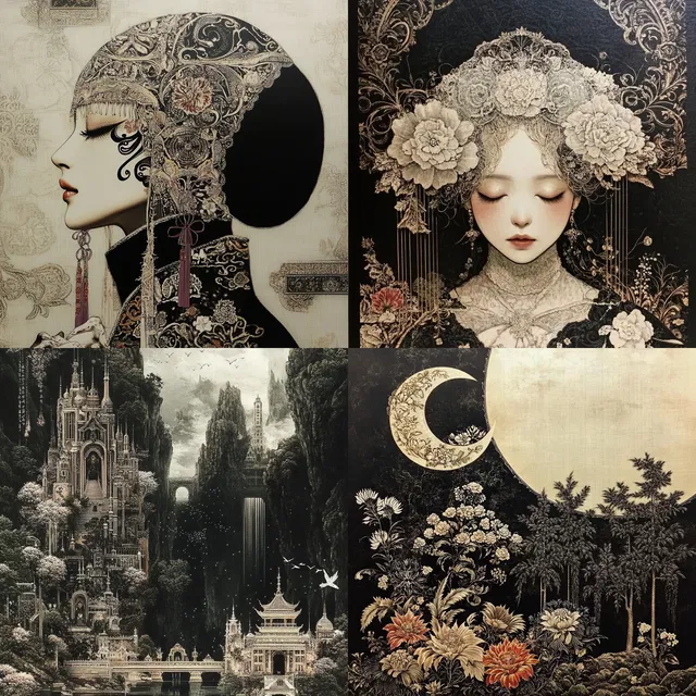 Этот стиль отличает изысканная сложность, в которой в каждой композиции переплетаются витиеватые узоры и роскошные детали. Использование монохромных и приглушённых тонов усиливает его неземное качество, напоминая об искусстве ар-нуво и символизме. Архитектурные элементы величественны и готичны, а образы персонажей излучают элегантность и уравновешенность.