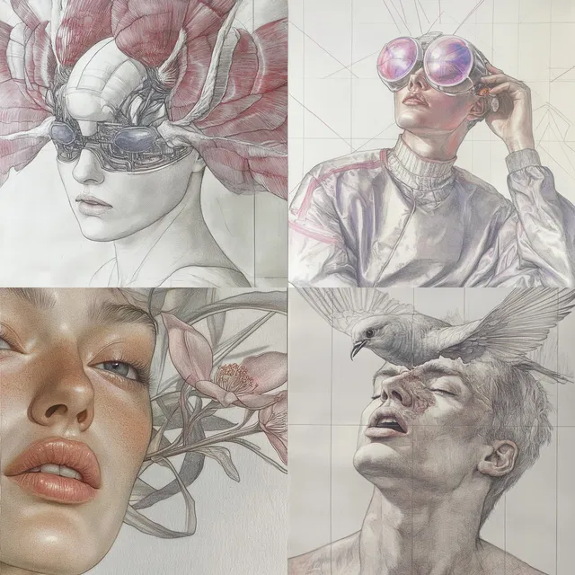 Воздушные линии и мягкие пастельные тона определяют этот стиль, объединяя сюрреалистические элементы с органическими формами. Детальные текстуры и тонкие тени создают сказочные композиции, часто включающие футуристические мотивы и элементы, вдохновлённые природой. Архитектурная точность и плавные структуры подчёркивают гармоничное сочетание механических и органических элементов.