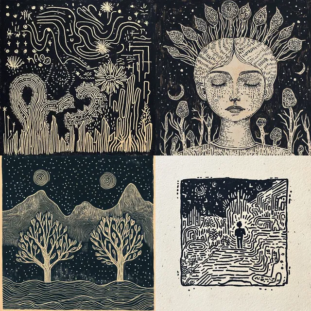 В этом стиле доминируют сложные линейные рисунки, которые создают фактурное и ритмичное визуальное восприятие, напоминающее о технике офорта и народном искусстве. Он искусно сочетает мифические и сюрреалистические темы с историческими и культурными влияниями, часто опираясь на эстетику модерна и византийского искусства.