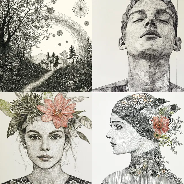 Стиль превосходно подходит для создания сложных композиций с тонким мастерством, напоминающим традиции гравировки и работы пером и чернилами.