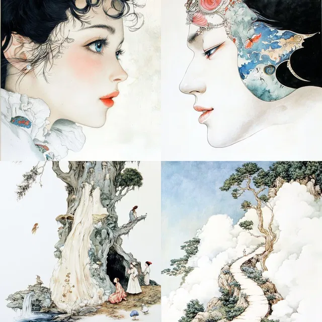 Воздушная элегантность очаровывает своей замысловатой детализацией и изящными линиями, создавая сказочную атмосферу, одновременно изысканную и причудливую. Композиции тщательно продуманы, с акцентом на изящные фигуры и гармоничные пейзажи. Цветовая палитра мягкая и приглушённая, что усиливает эфемерность визуальных образов. Этот стиль отлично подходит для создания атмосферы фантазии и воображения, опираясь на культурные и традиционные темы. Он прекрасно проявляет себя в художественных и иллюстративных проектах, но может оказаться недостаточно смелым для более динамичных или современных применений.