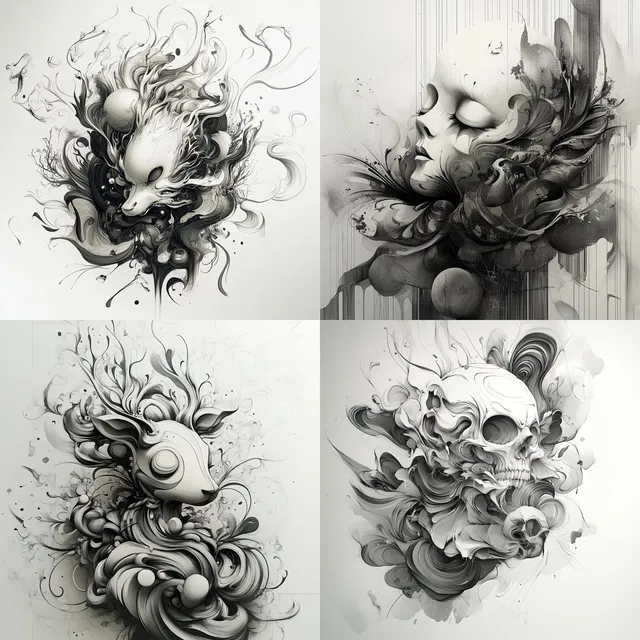 Динамика жидкостей и органические формы играют главную роль, создавая сюрреалистичные композиции с воздушными текстурами и образами, похожими на сны. Замысловатые детали и витиеватые узоры вызывают ощущение движения и глубины, а монохромная палитра усиливает мистическую атмосферу.