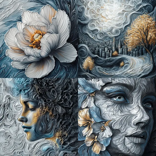 Вихри мазков и динамичные линии определяют этот стиль, создавая плавные формы и естественные очертания, которые вызывают ощущение сказочного реализма. Здесь преобладают текстурная глубина и многослойная сложность. Замысловатые детали и изысканные поверхности усиливают визуальное повествование. Приглушённые оттенки синего и нежный золотой в цветовой палитре добавляют гармоничный баланс, дополняя неземную и мистическую атмосферу.