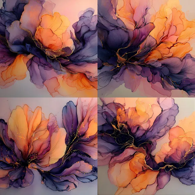 Доминируют насыщенные фиолетовые и сочные оранжевые оттенки, которые создают сказочную атмосферу благодаря плавным органическим формам. В этом стиле прекрасно передаётся эфемерная красота через изящные движения и полупрозрачные слои, напоминающие об искусстве ар-нуво и сюрреализме. Хотя он отлично подходит для абстрактных и фантастических сюжетов, его живописность может не обеспечить точности в контексте фотореализма. Идеален для модного дизайна, текстильных узоров и брендинга, он предлагает мистическое путешествие через динамику текучих форм и органическую абстракцию.