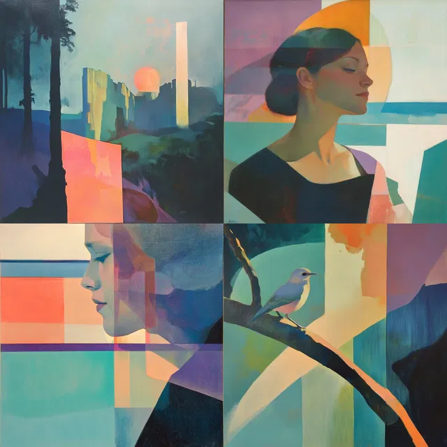 Геометрическая абстракция занимает доминирующее положение. Многослойные композиции и мягкая цветовая палитра создают гармоничный визуальный язык. Стилизованные формы и перекрывающиеся фигуры рождают атмосферу, напоминающую сон, сочетая модернистскую абстракцию с влиянием Баухауса и конструктивизма.