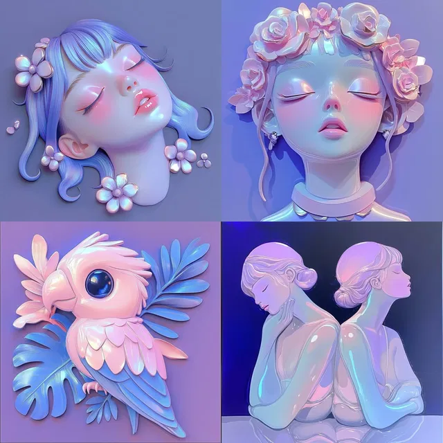 В этом стиле преобладают глянцевые, переливающиеся поверхности, которые создают сказочную, эфемерную атмосферу в самых разных сюжетах. Использование пастельных цветов и отражающих текстур придаёт изображению сюрреалистичность, а плавные, органические формы усиливают ощущение причудливости и волшебства.