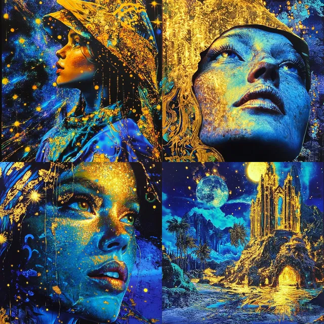 Этот стиль поражает своей лучезарностью и пышностью. Он завораживает использованием ярких оттенков синего и мерцающего золота, создавая неземную и потустороннюю атмосферу. Композиции отличаются детальной проработкой: замысловатые узоры и небесные мотивы пробуждают ощущение волшебства.