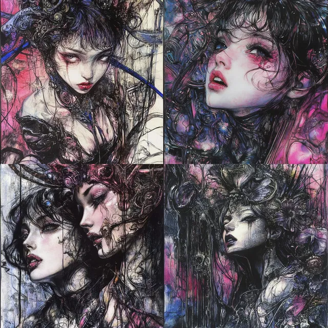 Этот стиль отличает сложная детализация и сюрреалистичные образы, в которых готические мотивы сочетаются с неземной эстетикой. Насыщенные текстуры и тщательно продуманные композиции создают атмосферу сновидений, а выразительные черты и резкие контрасты придают эмоциональную глубину. Преобладание призрачно-фиолетовых и мистически-синих оттенков в цветовой палитре усиливает ощущение потусторонности.