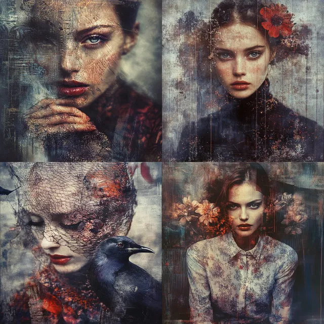 В этом стиле преобладают влияния сюрреализма: многослойные текстуры и неземная эстетика создают сказочную атмосферу. Сложные композиции и замысловатые детали вызывают мистическое настроение, сочетая готические мотивы с загадочными темами. Приглушённая цветовая палитра усиливает сюрреалистичное настроение, а фактурные поверхности добавляют глубины и насыщенности.