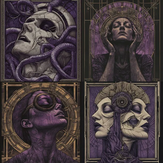 Эфирный готический фьюжн завораживает своей сложной линейной работой и символическими мотивами, сочетая в себе элементы ар-нуво и неоготики. Геометрическая точность и симметричные композиции стиля создают ощущение архитектурного величия, а монохромная палитра и драматичные тени усиливают его мистическую ауру.